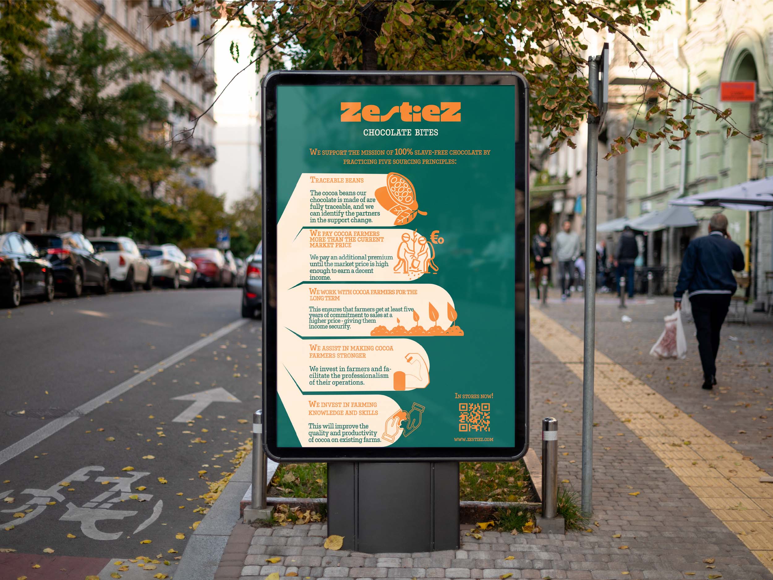 I started by researching Gen Z’s culture, values, and aesthetics. The name “ZestieZ” came from blending energetic, playful language with a nod to the generation itself. Once the name clicked, the visual direction followed: bold typography, high-contrast colours, and an octagon-shaped dieline that stands out on the shelf. Ethical sourcing was highlighted throughout the packaging and poster design, aligning the product with Gen Z’s demand for transparency and fairness.